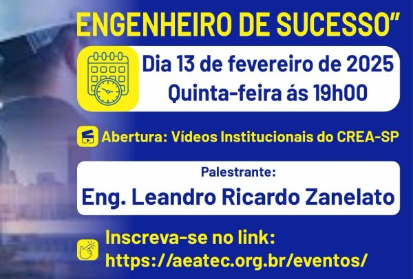A Associação dos Engenheiros, Agrônomos e Tecnólogos de Carapicuíba tem o prazer de convidar você para a palestra “Como se tornar um engenheiro de sucesso” Um evento online imperdível para impulsionar sua carreira! Data: 13 de fevereiro 2025 Horário: 19h Descubra os segredos dos profissionais de sucesso, aprenda as melhores estratégias e inspire-se[…..]