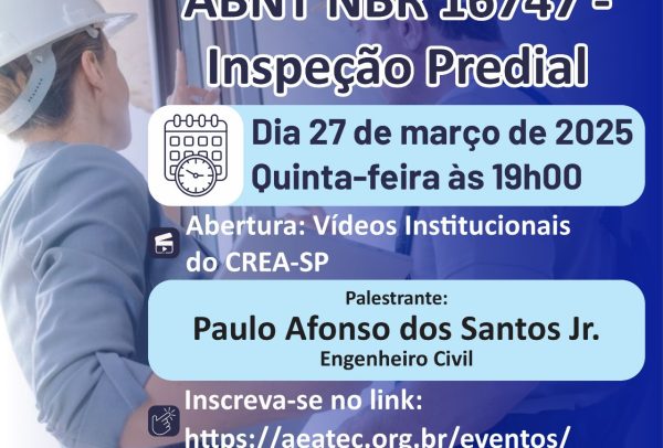 Prezados Profissionais de Engenharia, Temos o prazer de convidá-los para a palestra”ABNT NBR16747 – Inspeção Predial”, que será realizada no dia 27 de março de 2025, às 19h – online Sua participação é de grande importância para enriquecer e fortalecer a troca de conhecimentos entre os profissionais da área. Data: 27de março de 2025 online […]
