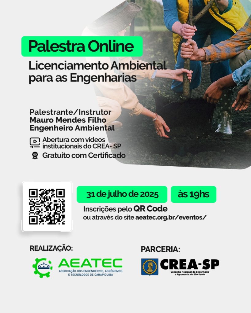 Para confirmar sua participação acesse: https://aeatec.org.br/eventos/ a Associação dos Engenheiros, Agrônomos e Tecnólogos de Carapicuíba.