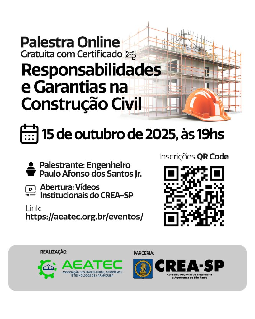 Para confirmar sua participação acesse: https://aeatec.org.br/eventos/ a Associação dos Engenheiros, Agrônomos e Tecnólogos de Carapicuíba.